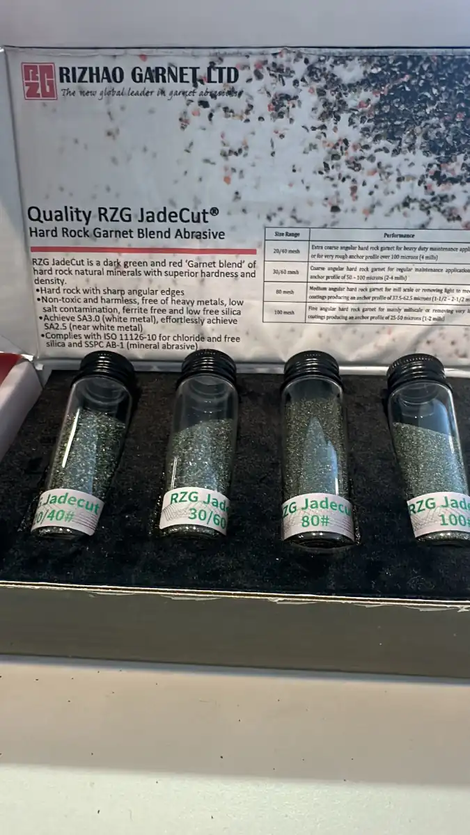 Garnet y JadeCut son abrasivos de roca dura de alta calidad, de gran dureza y tenacidad, con bordes angulares afilados que dan lugar a un excelente rendimiento de granallado y corte. Ambos abrasivos no contienen metales pesados ni ingredientes tóxicos y cumplen incluso los requisitos internacionales más estrictos en materia de salud y seguridad en el trabajo.