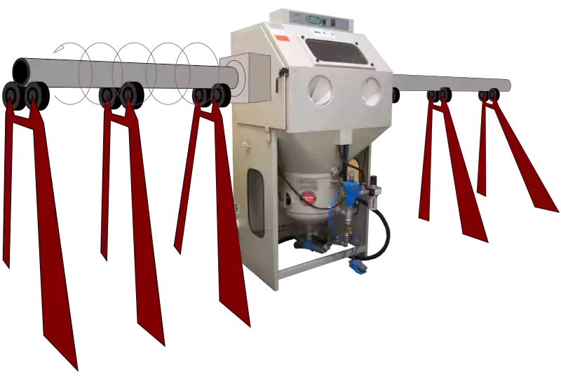 Equipo de operación manual utilizado para limpieza, texturizado y shot peening de piezas con todo tipo de abrasivo como granalla de acero al carbono, granalla de acero inoxidable, granalla de óxido de aluminio, arena, perla de vidrio, entre otros. Posee un sistema compacto donde el abrasivo disparado se recicla y purifica a partir del flujo aire generado por un extractor, las partículas de polvo e impurezas que son arrastradas por este flujo, son atrapadas en un juego de sacos colectores, permitiendo que el aire liberado al ambiente este completamente limpio y la cámara de trabajo libre de polución. Los equipos CMV son construidos y probados bajo normas técnicas internacionales.