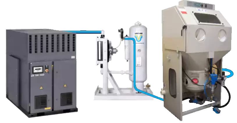 Nota importante: Para obtener un proceso de chorro abrasivo optimo, se recomienda una instalación como lo muestra la imagen principal, en la que el aire proveniente del compresor pasa primero por una unidad especial de tratamiento de aire para eliminar al máximo su humedad y de esta manera garantizar que el abrasivo no sufrirá apelmazamientos ni contaminación por la humedad.