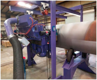 La caja de cierre tiene movimiento rápido en los cierres de tuberías que van desde «2» de diámetro hasta 8″ de diámetro. La caja de cierre tiene un sistema de recogida (no mostrado) que incluye una tolva y el transportador de tornillo que recoge la granalla que cae fuera de la caja de cierre y lo lleva de nuevo a la máquina. |