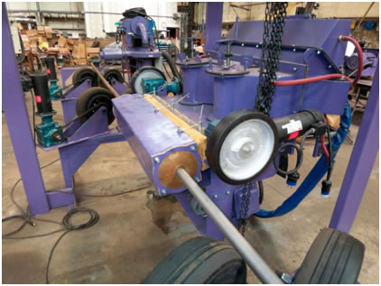 Los carros de vigas se extienden a ambos lados de la tubería para que una segunda máquina pueda ser añadida para duplicar las tasas de producción. |