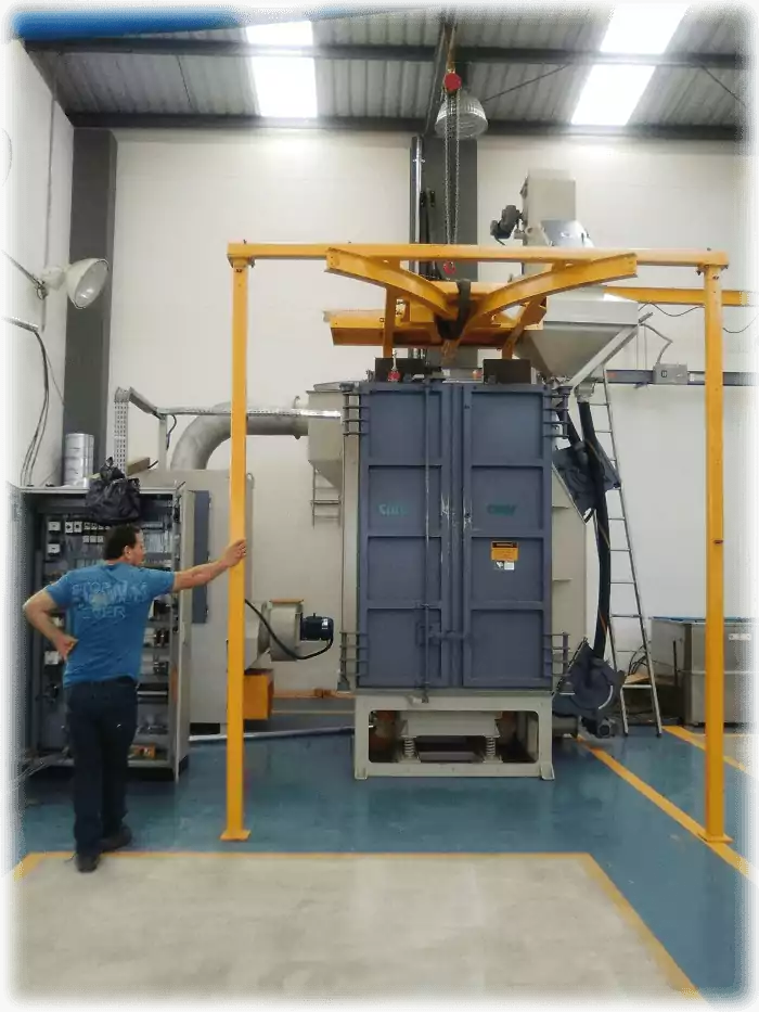 Esta máquina posee un sistema colector de abrasivo que consta de un tornillo sinfín, un elevador de cangilones, un purificador de abrasivo y un colector de polvo con sistema de limpieza de filtros automático. Por su diseño es un equipo de alto rendimiento tanto para piezas livianas y de gran tamaño. Diseñada y construida por CMV.