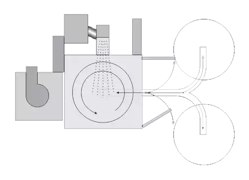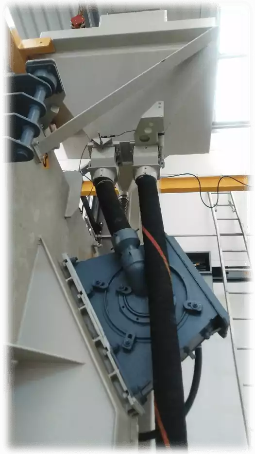 Formado por un conjunto de tornillos que conducen el abrasivo lanzado por las turbinas hasta un tornillo transportador transversal, reduciendo el alto total del equipo en aproximadamente 800 mm.