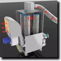 El purificador recibe el abrasivo del elevador de cangilones y regula el flujo a través de una escotilla superior, distribuyéndolo de manera uniforme sobre los deflectores del limpiador de aire. La corriente de aire producida por el sistema de escape, con velocidad de flujo ajustable, pasa a través de los deflectores del sistema de lavado capturando polvo e impurezas además del abrasivo fino que no es apto para su uso.