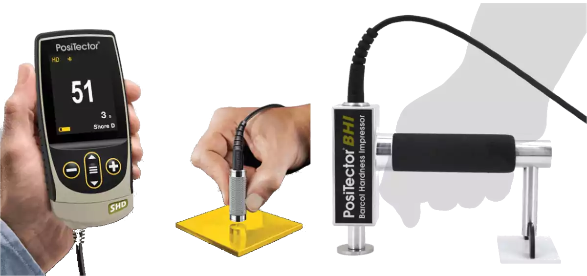 DeFelsko ofrece pruebas de dureza digitales portátiles de acuerdo con dos escalas de dureza reconocidas diferentes: Shore y Barcol. El medidor de dureza Shore, PosiTector SHD está disponible en las escalas Shore A y Shore D para medir la dureza de indentación de materiales no metálicos. El Impressor de dureza PosiTector BHI Barcol es ideal para medir la dureza de indentación de metales blandos, plásticos más duros y plásticos reforzados con fibra.