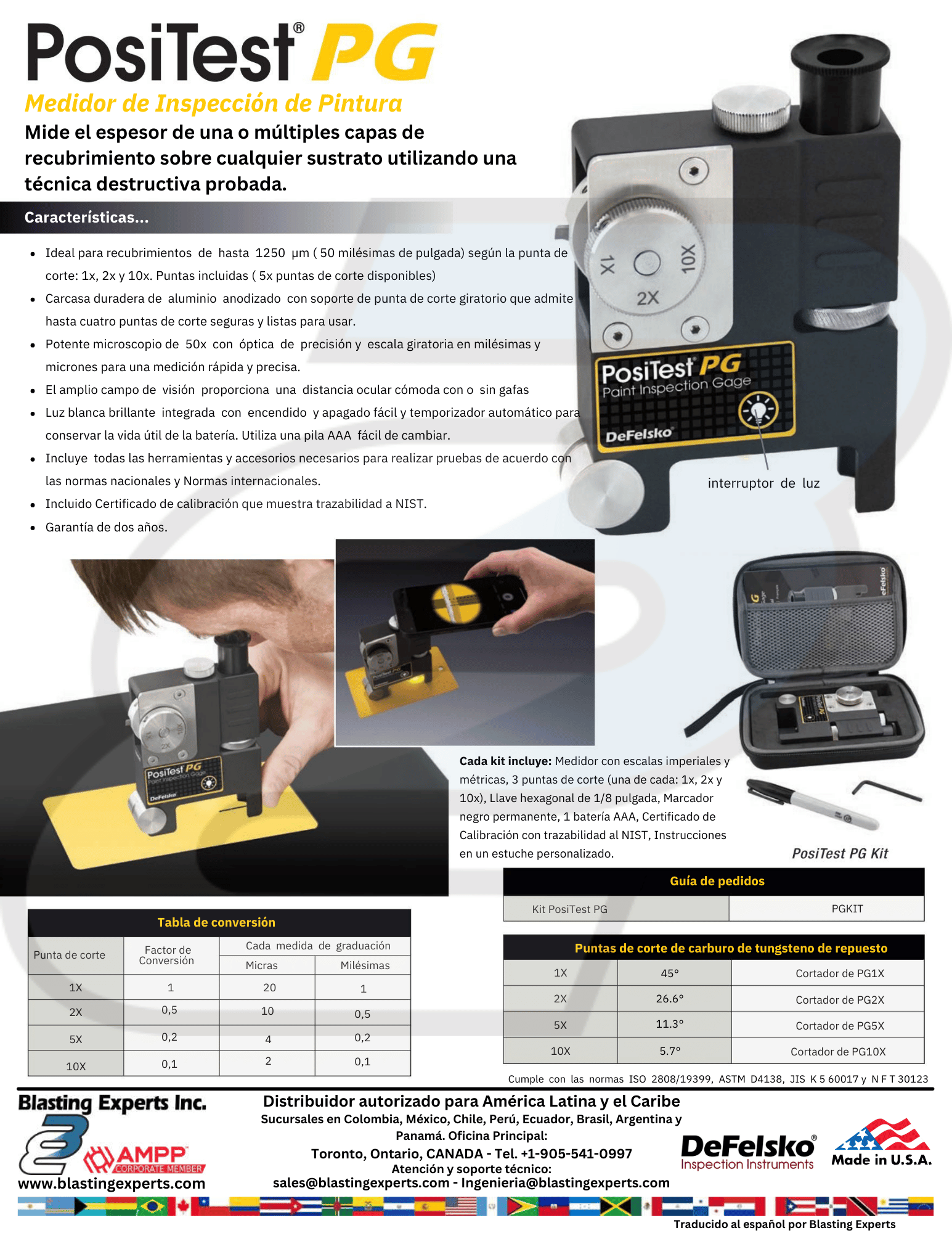 El diseño del PosiTest PG incluye puntas de corte intercambiables (1X, 2X, 10X) que se seleccionan según el espesor esperado del recubrimiento, permitiendo mediciones precisas incluso en aplicaciones desconocidas mediante una medición inicial con la punta de 2X. Además, cuenta con un microscopio de 50x con escala métrica e imperial para análisis detallados, y su carcasa de aluminio anodizado garantiza durabilidad en entornos exigentes.