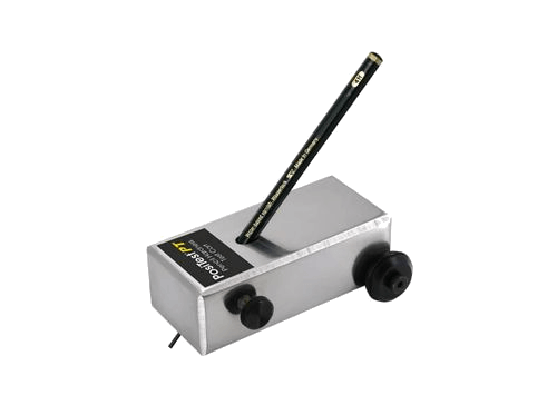 Al realizar una prueba de dureza de lápiz, los lápices tienen una escala de dureza que va de 6B (el más blando) a 6H (el más duro) y actúan como un indentador al ser empujados por la superficie a mano o con la ayuda de un carro.