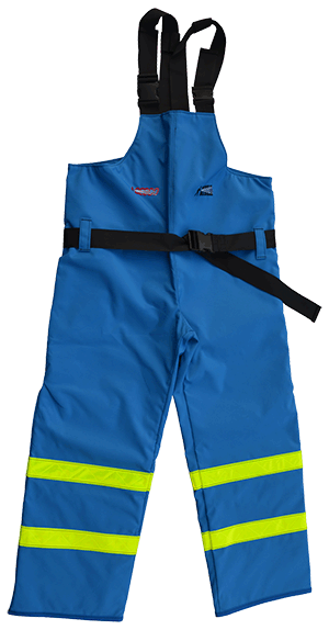 Correas de hombro y cinturón de seguridad  ajustables. Aberturas de pierna anchas con cierres de cremallera, cintas reflectantes para la visibilidad.