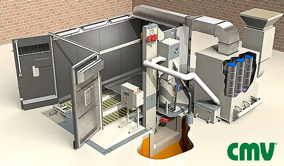 - Un módulo para limpieza y reciclaje de abrasivo compuesto por un elevador de cangilones, marca CMV